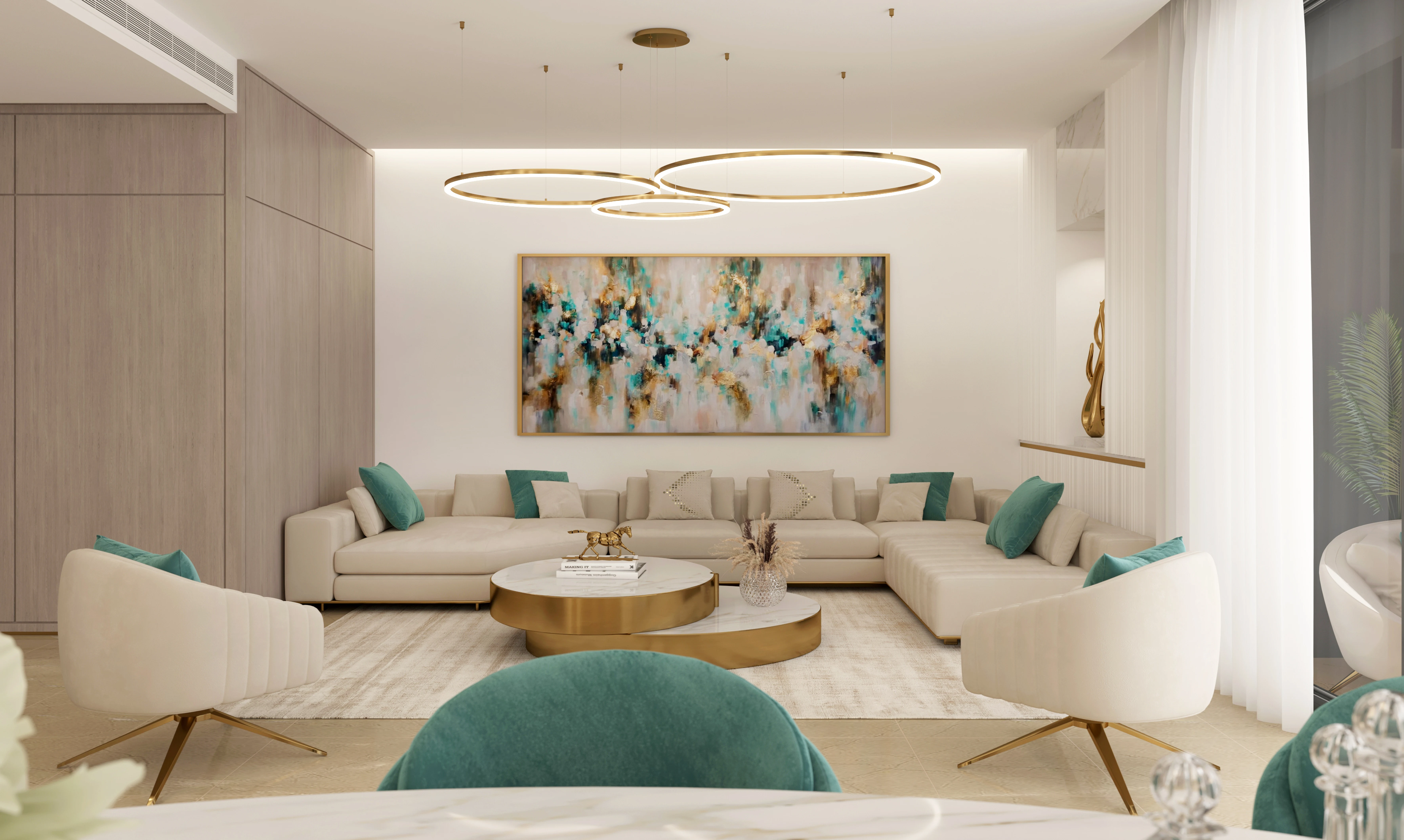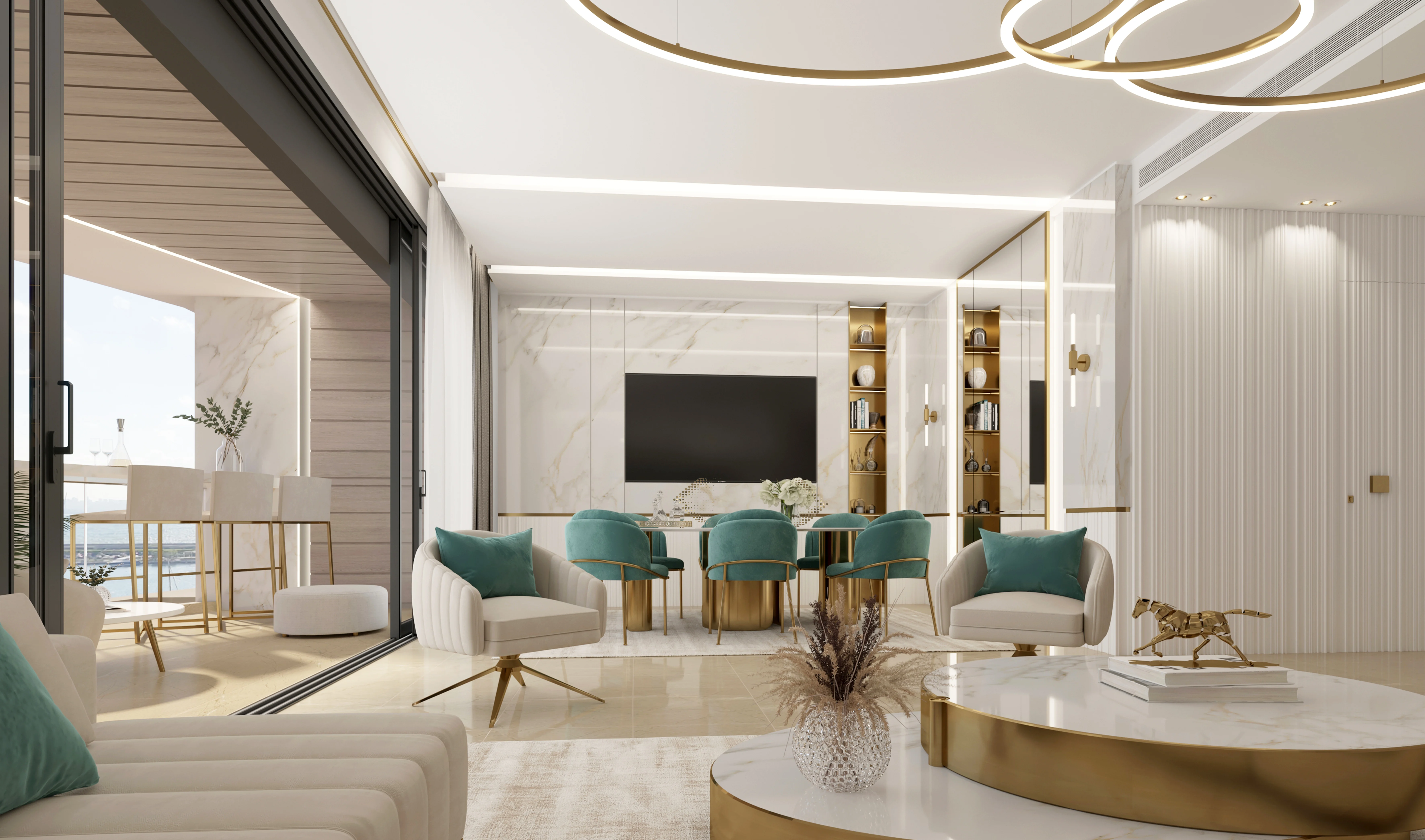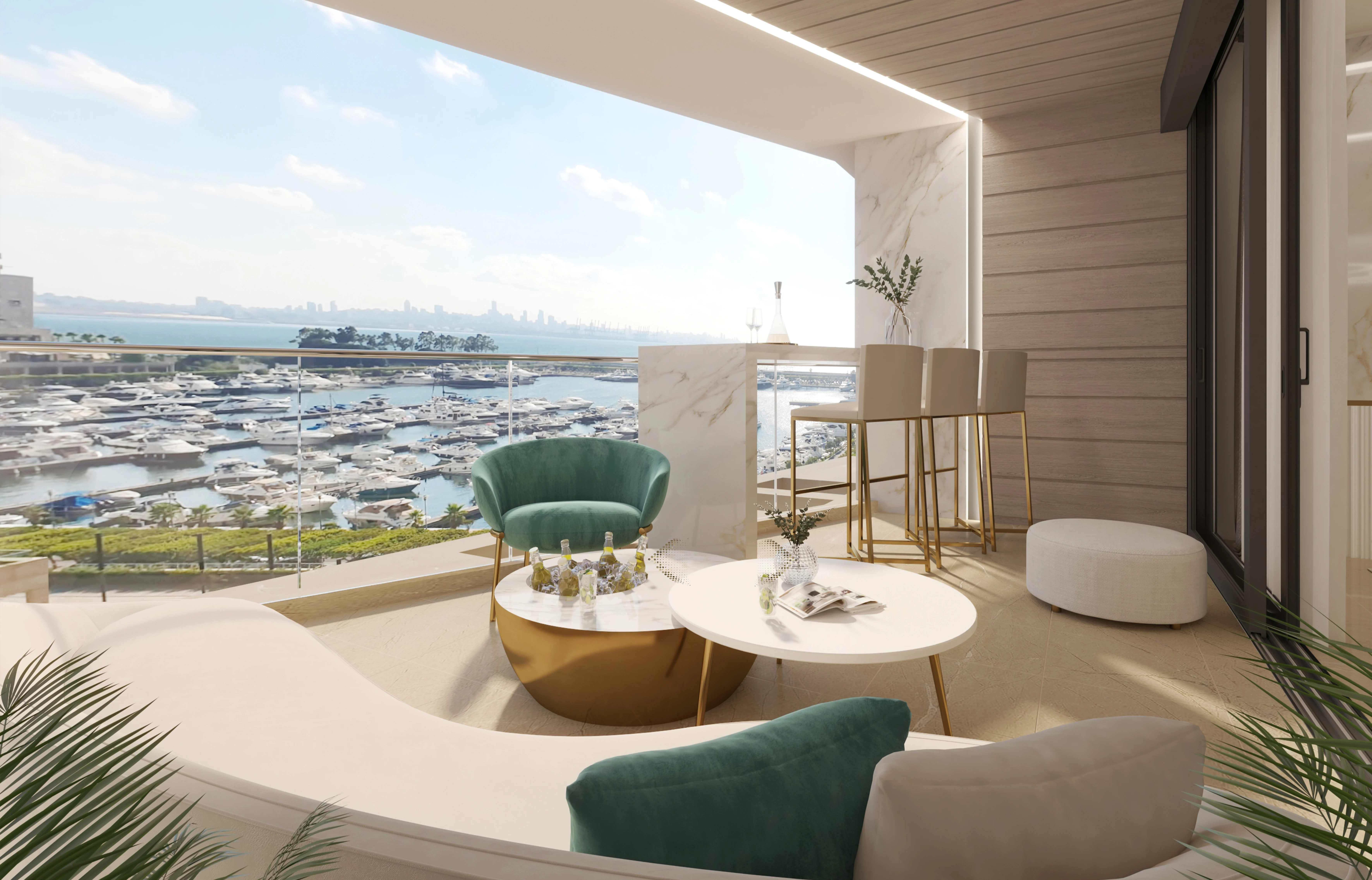 Designed as an elegant residential interior that frames panoramic sea views through open-plan spaces, soft material palettes, and carefully detailed finishes, creating a calm and luxurious waterfront living experience.