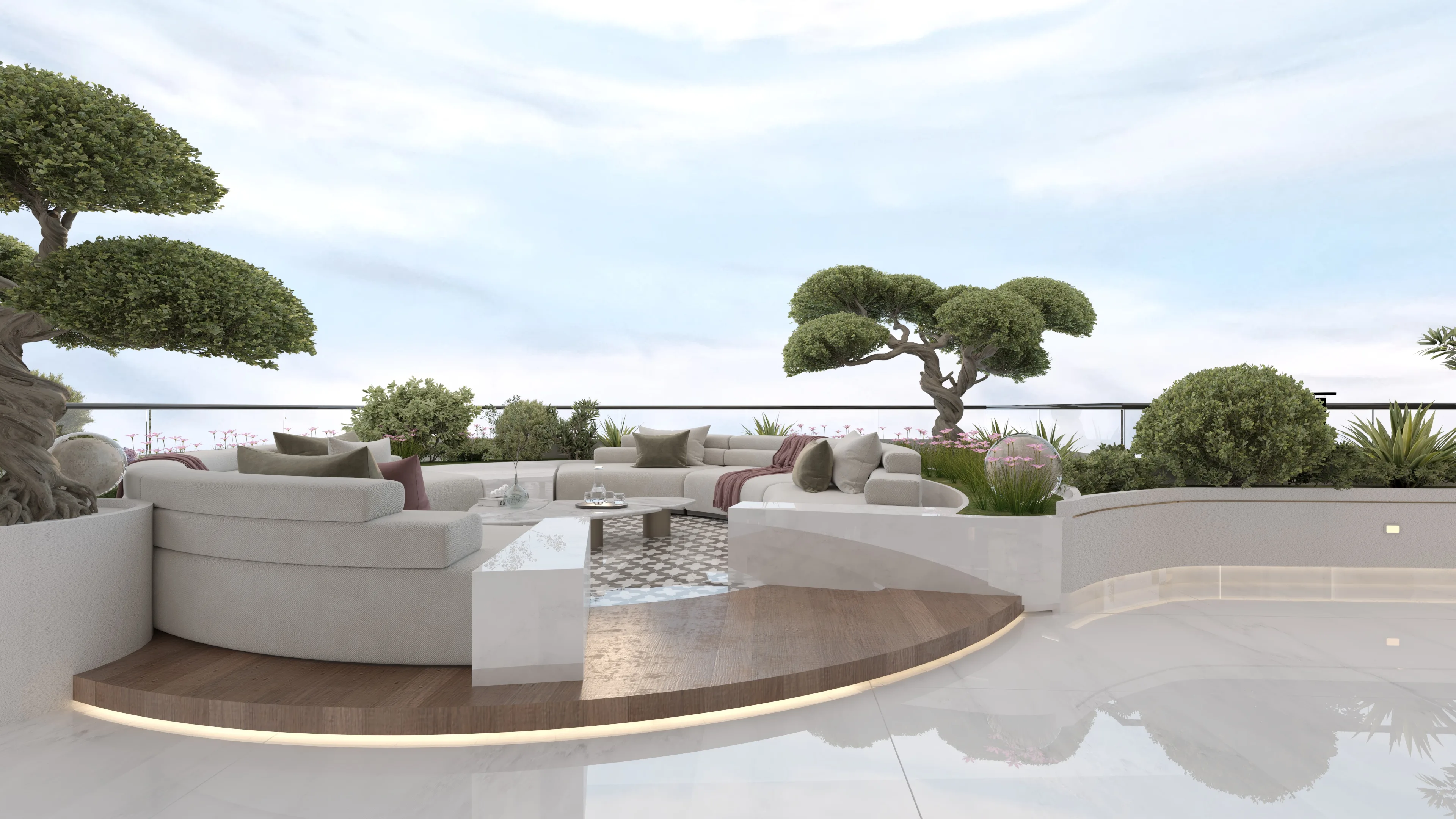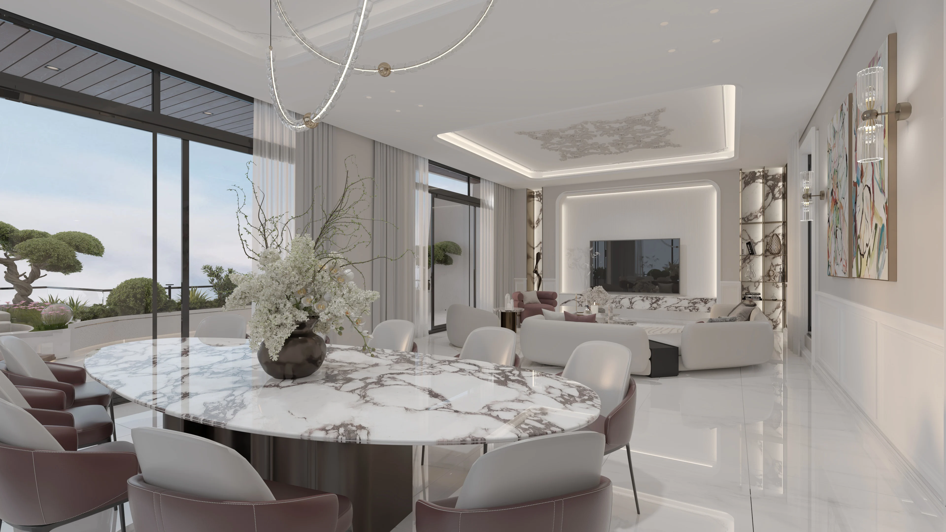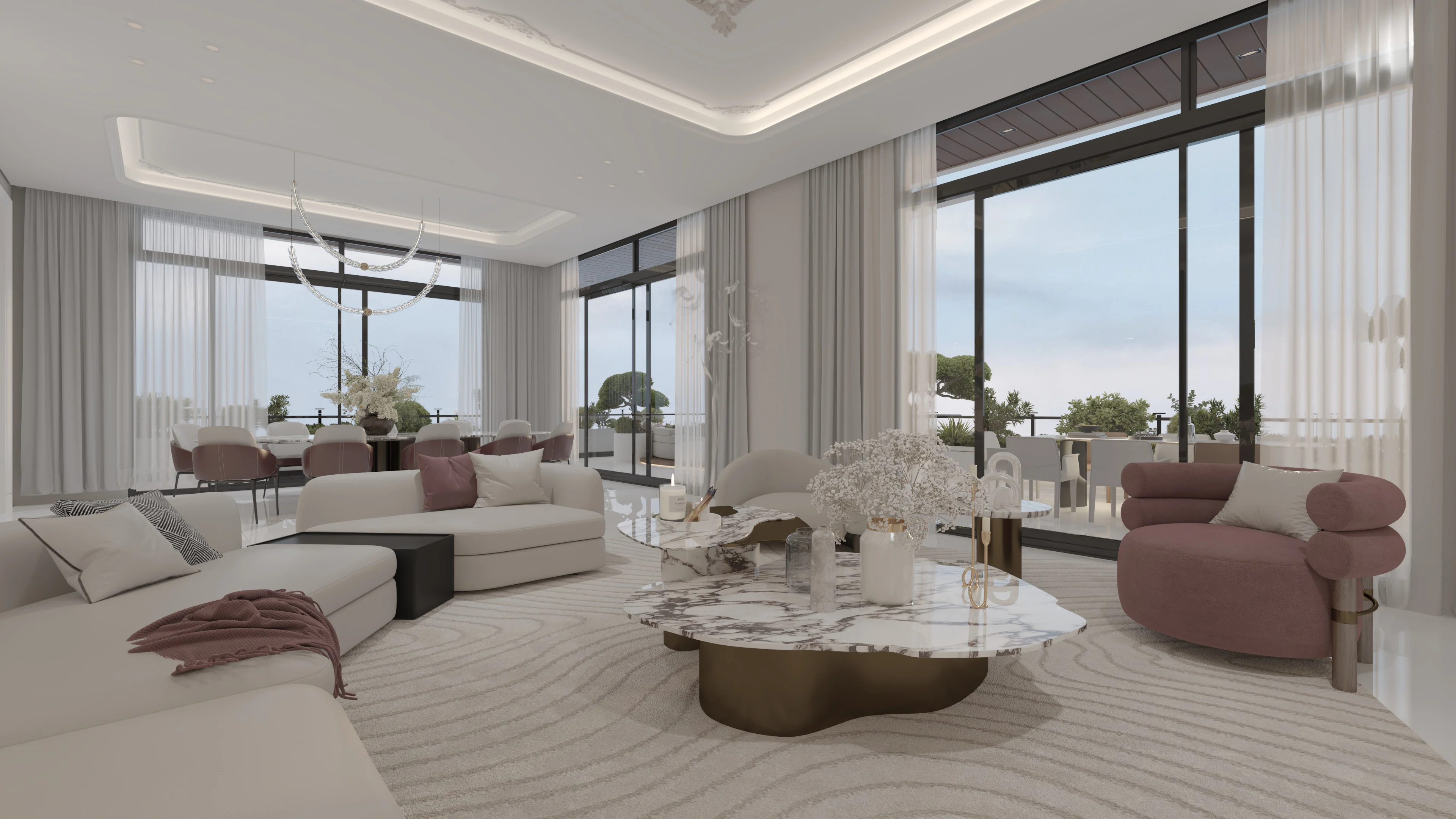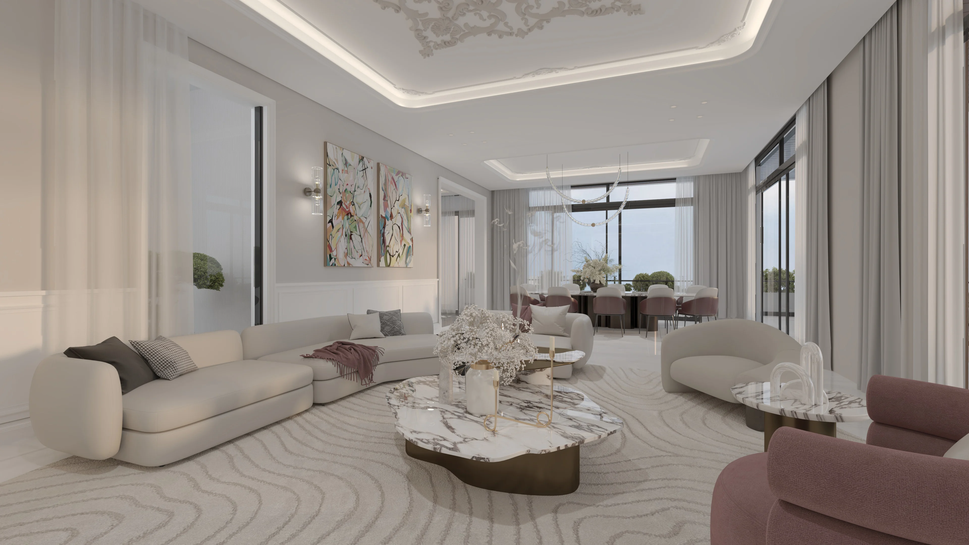 A neoclassical penthouse interior where timeless elegance is reinterpreted through contemporary refinement, featuring sophisticated detailing, expansive living spaces, and a panoramic terrace that extends luxury living toward open views and natural light.