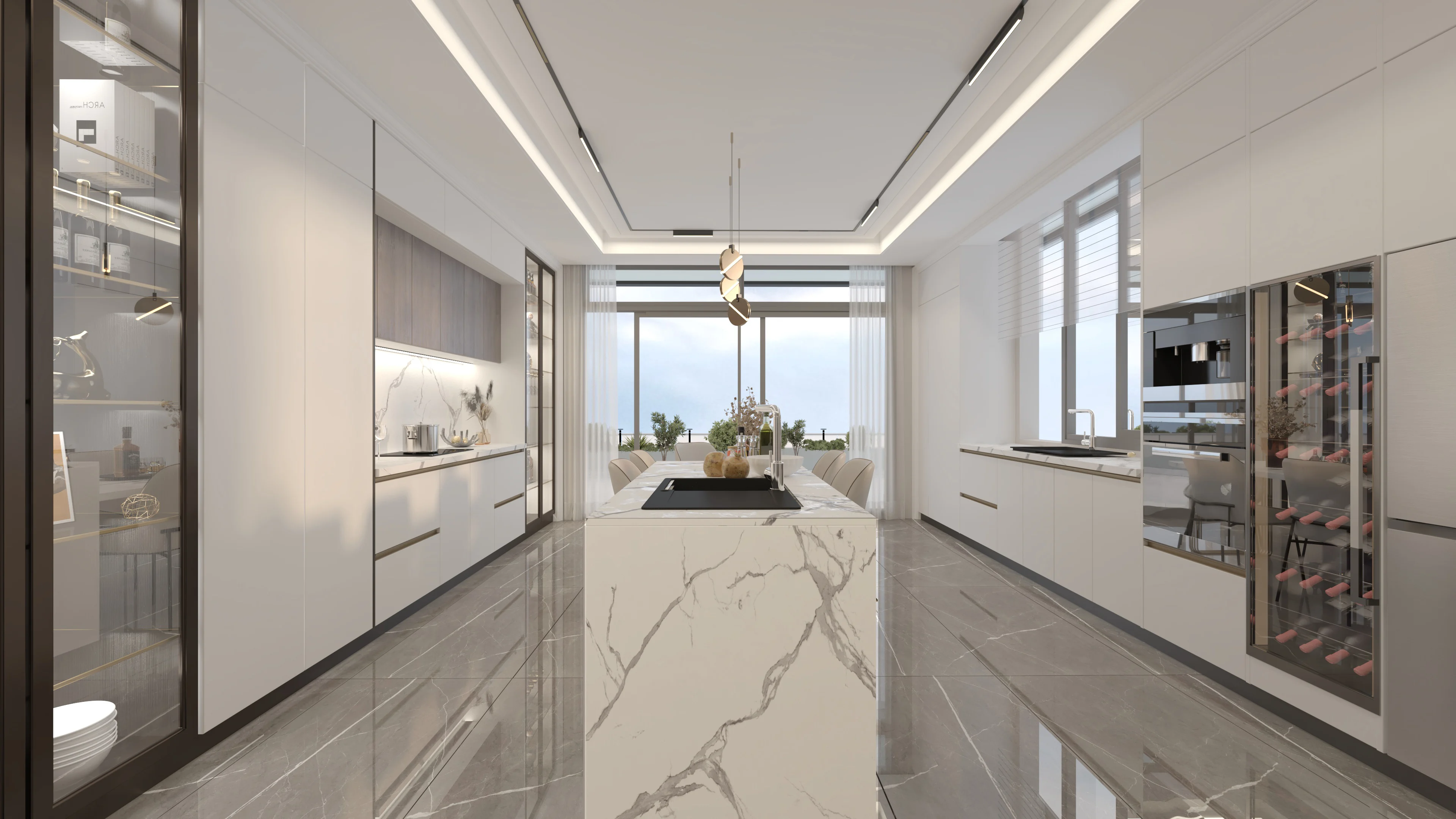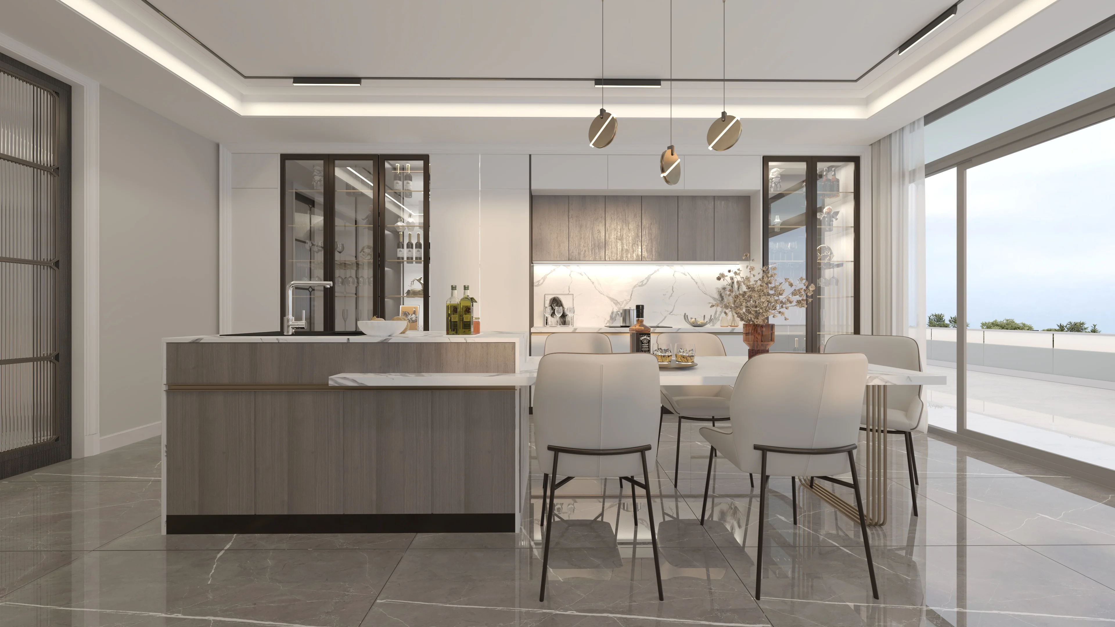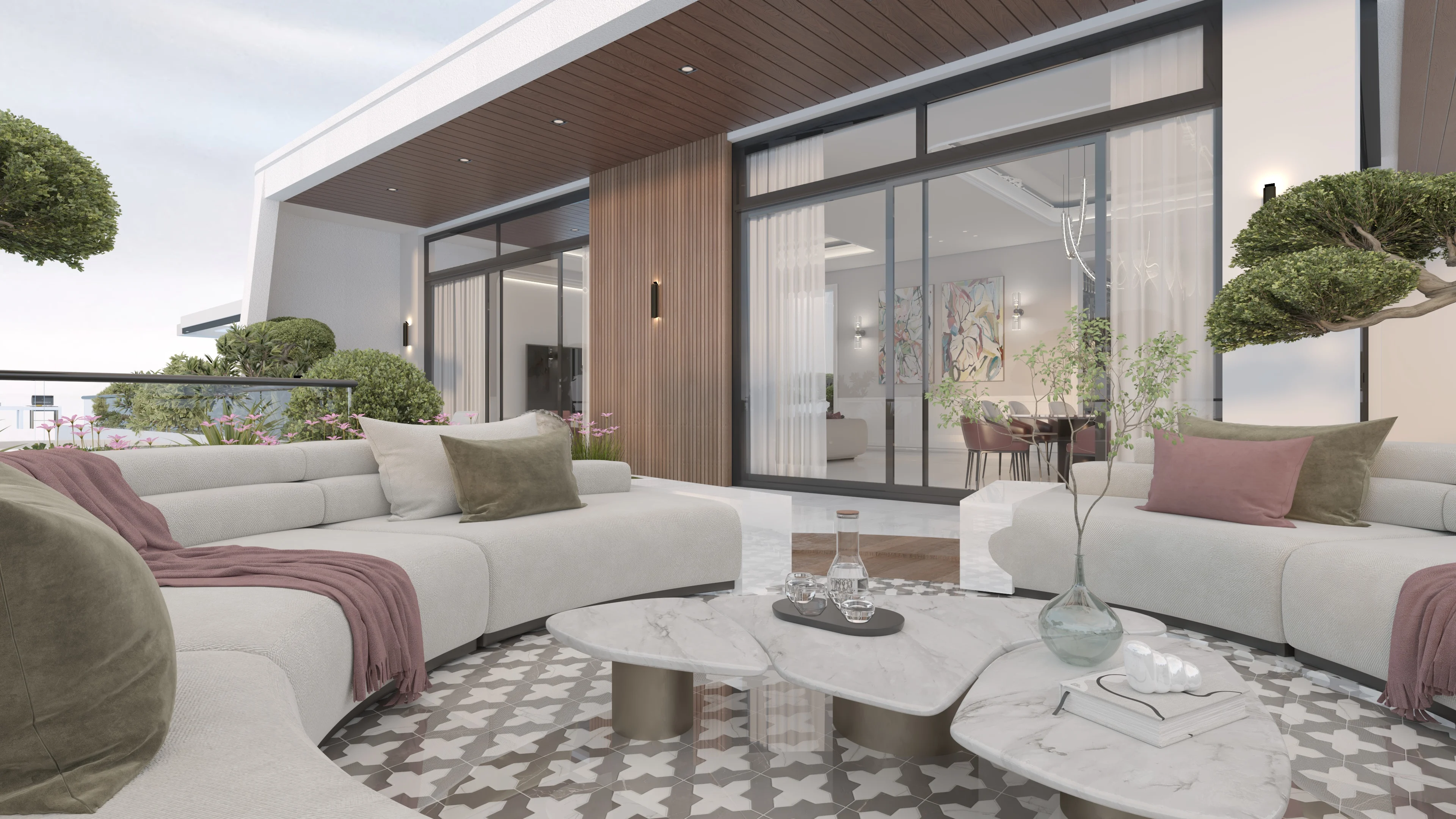 A neoclassical penthouse interior where timeless elegance is reinterpreted through contemporary refinement, featuring sophisticated detailing, expansive living spaces, and a panoramic terrace that extends luxury living toward open views and natural light.