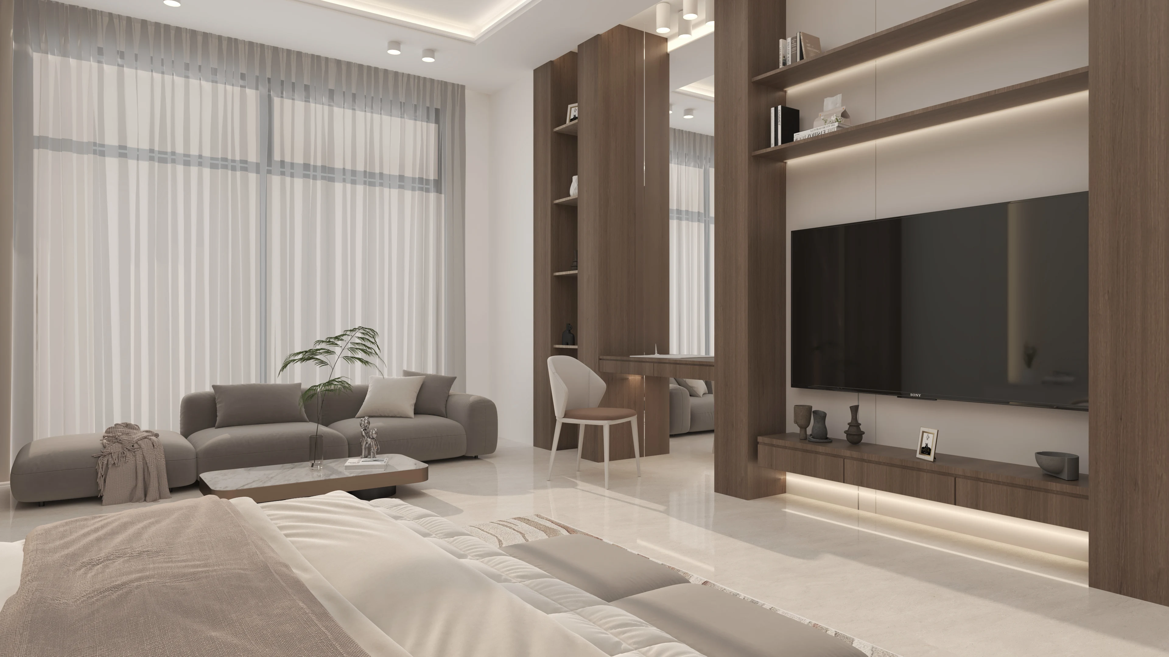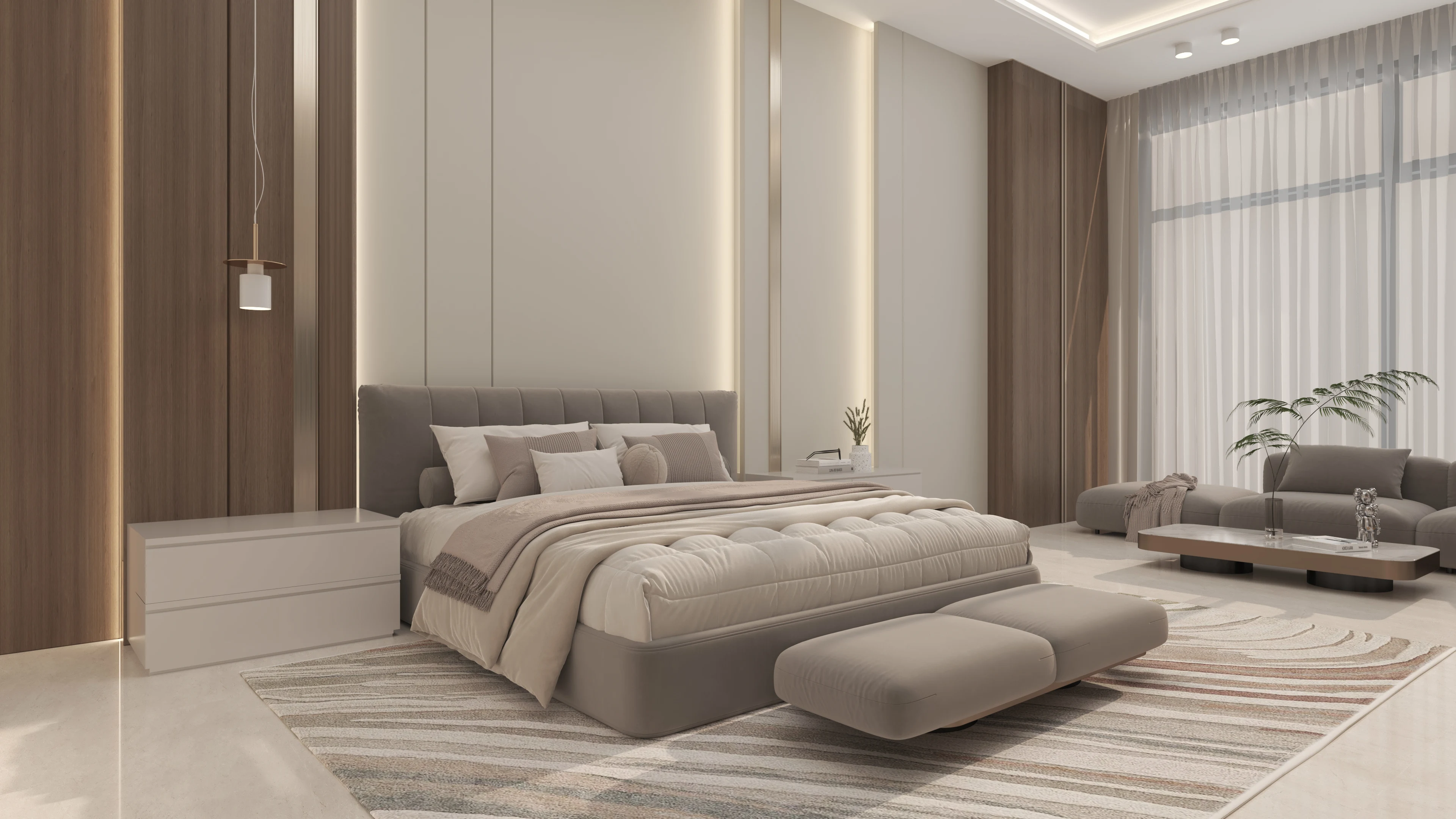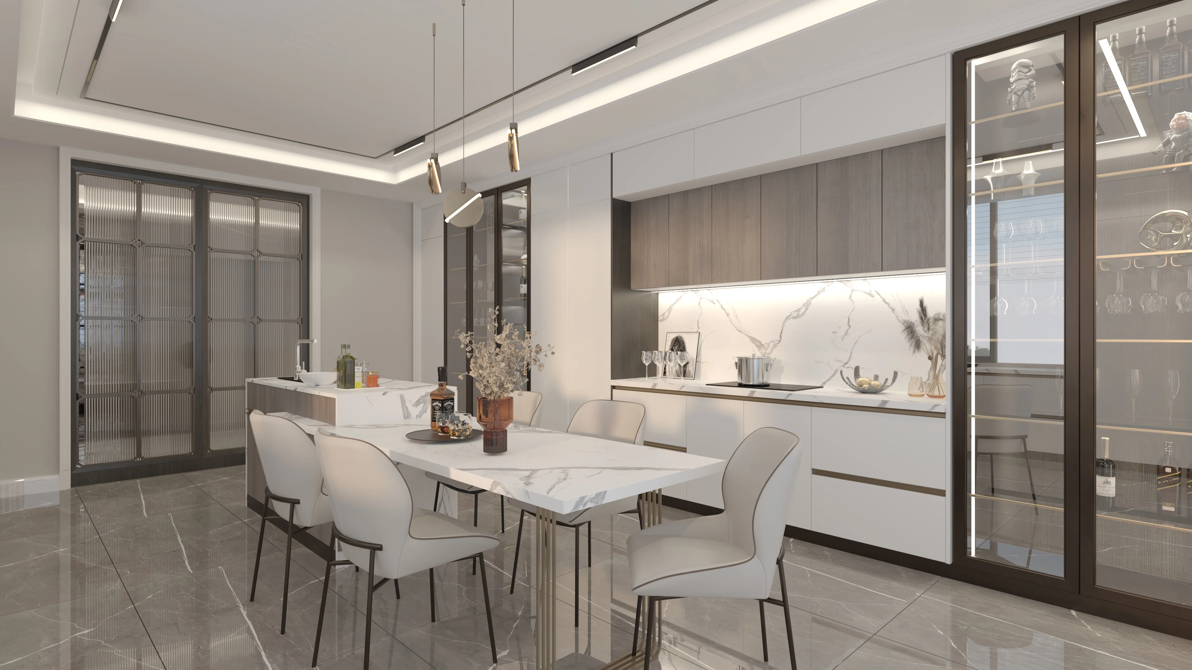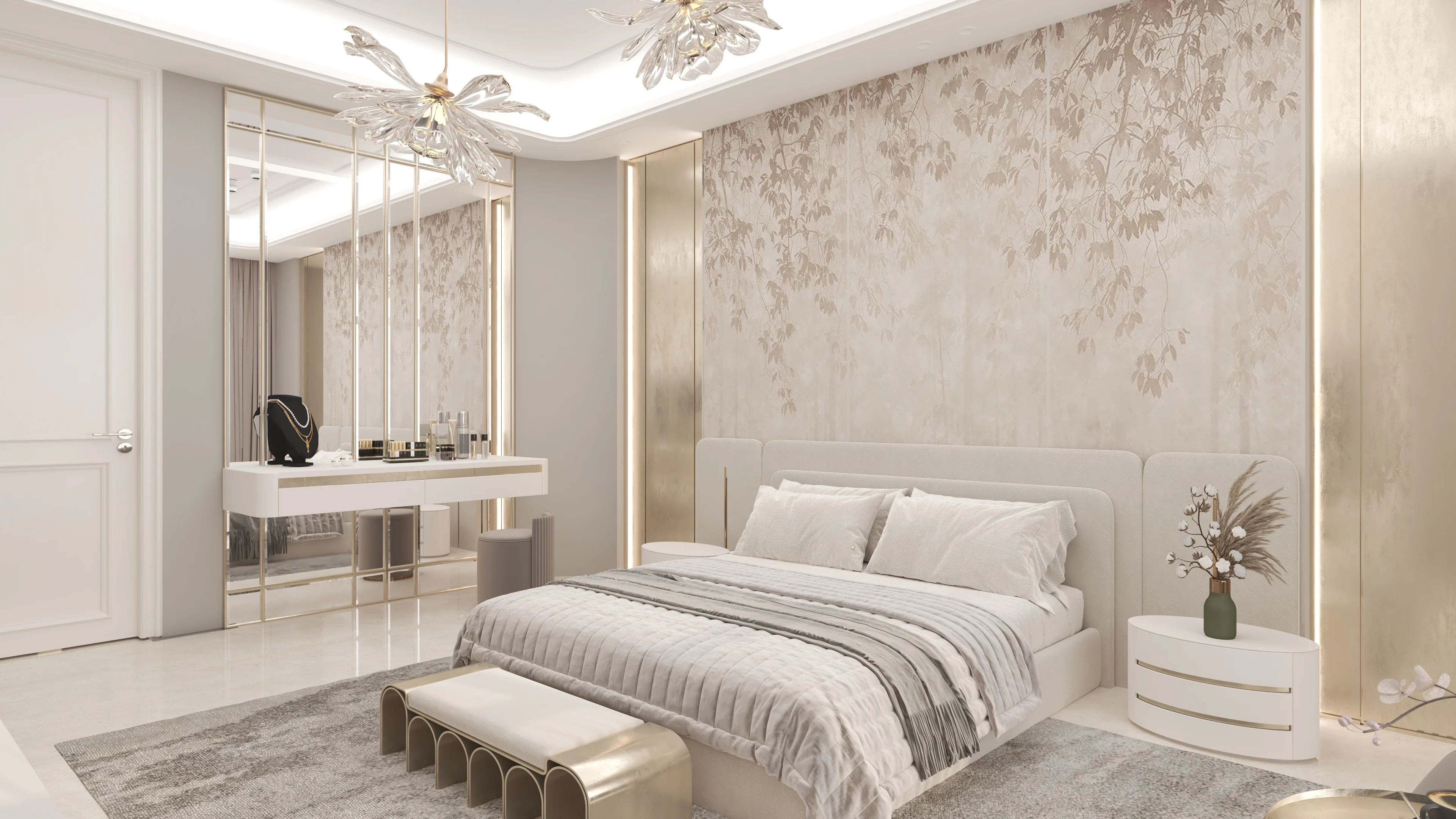 A neoclassical penthouse interior where timeless elegance is reinterpreted through contemporary refinement, featuring sophisticated detailing, expansive living spaces, and a panoramic terrace that extends luxury living toward open views and natural light.